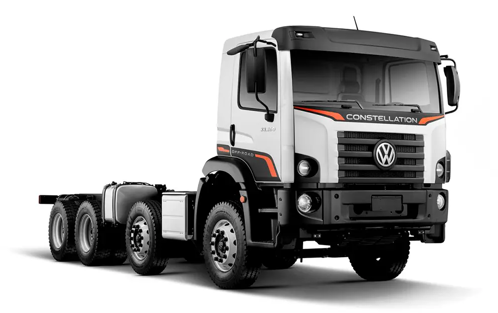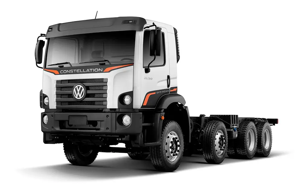 O Constellation 33.260 8x4 para operações fora de estrada e construção civil, continua mantendo a consagrada robustez necessária à estas aplicações com grandes novidades com o exclusivo pacote Off-Road e opção do pacote Constructor! Traz vantagens sob medida para a aplicação: para-choque curto metálico, e opções do novo volante multifuncional e do banco do motorista com cinto integrado.