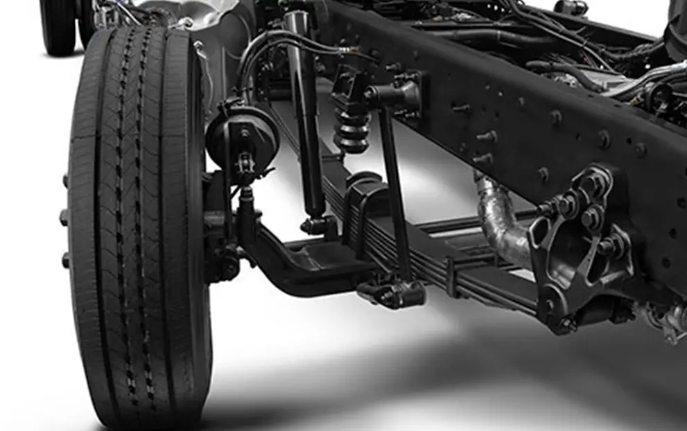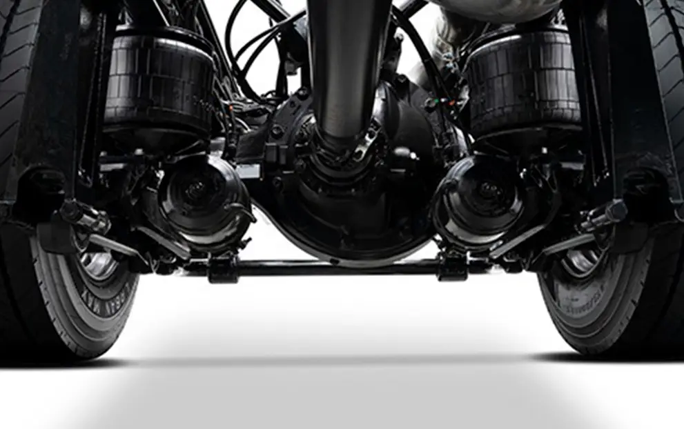 Molas Semi-elípticas com auxiliares parabólicas e de borracha (3° estágio), amortecedores hidráulicos de dupla ação, com barra estabilizadora / Pneumática com 4 bolsões de ar, amortecedores hidráulicos de dupla ação e barra estabilizadora